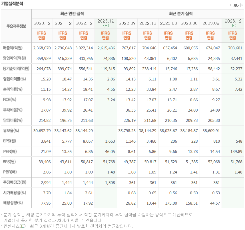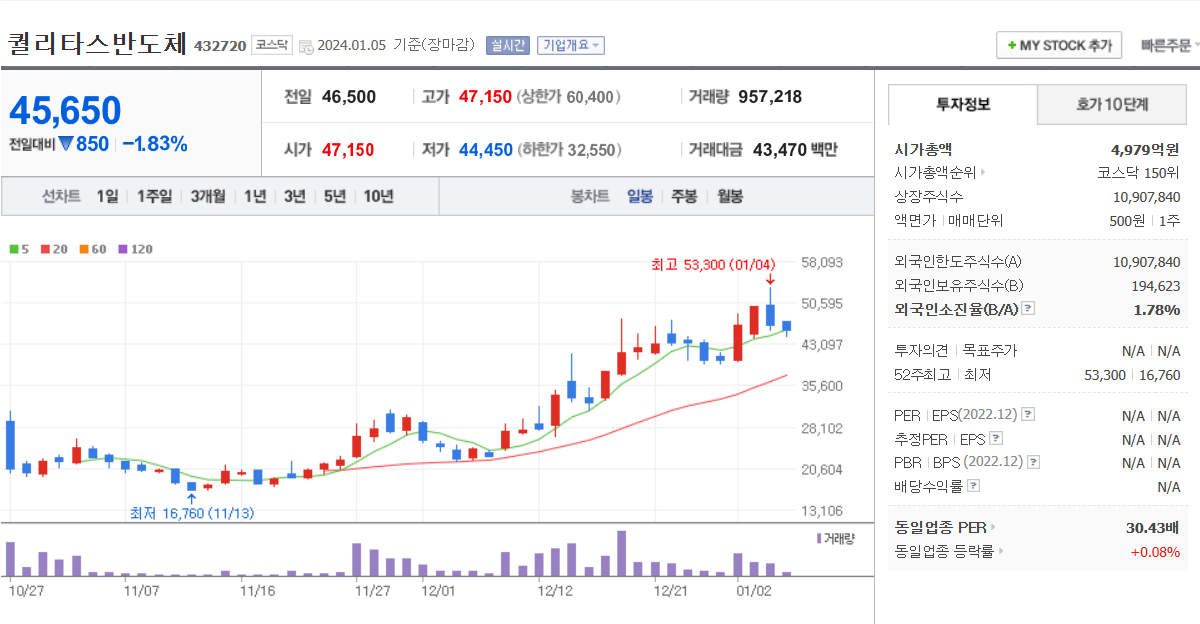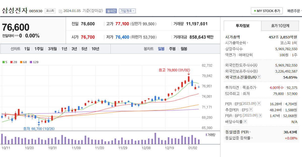 삼성전자가 8만전자의 자리를 노리는 등 연초 AI와 함께 반도체는 엄청 좋은 움직임을 보여주고 있으며 전문가들은 2024년 주도주는 반도체, AI 그리고 IT 가 될 것이라고 예상한다. 보통 연초에 힘이 좋은 테마들이 한해를 이끌어가는 주도섹터가 되는 경우가 많기 때문이다. 올해는 정말로 반도체의 해가 될 것 같다. ps 0% 삼성전자도 작년은 적자 투성이었던 SK하이닉스도 주가는 나날이 52주 신고가를 갈아치우는 모습을 보여주고 있다. 우리는 이런 반도체 주식의 꼭대기는 어디일지 한번 지켜보도록 하자.