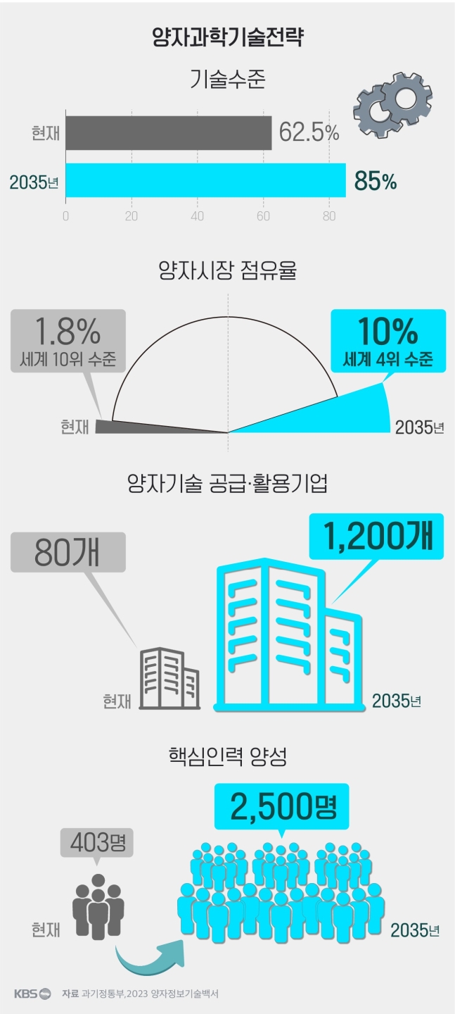 영화 오펜하이머가 나오며 양자 역학이 한참 주목받았던 시기가 있었다. 우리가 볼 때라 보지 않을 때 관측 결과가 달라지니 어쩌니 아무튼 그런 아무튼 그런 양자 역학이 적용된 양자 컴퓨터가 나온다면 우리 세계가 또 새로운 세상이 펼쳐진다는 말을 한다. 양자컴퓨터가 명확하게 어떤 것이라 서술하지는 못하지만 출시된다면 슈퍼컴퓨터는 아무것도 아니게 될 것이고 비트코인의 마저 해킹 가능 할 것이라는 우려까지 나올 정도로 높은 성능을 예상한다. 그런 양자역학시장에서 우리나라도 뒤처지지 않기 위에 수많은 투자를 계획하고 있으니 앞으로 인공지능 AI 만큼이나 주목해 볼 필요가 있다고 생각한다.