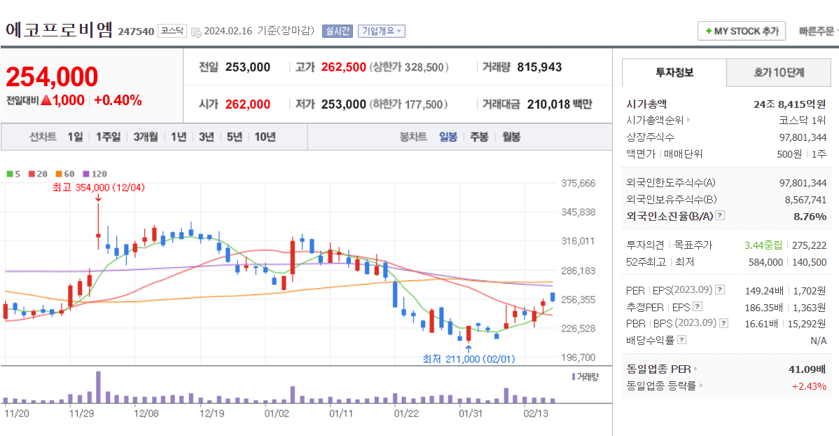 대표적인 2차전지 관련이며, 리튬주이온전지를 생산하고 있다. 또한 에코프로는 독일 AMG리튬으로부터 5000톤 수산화리튬 공급 체결 이력이 있다.