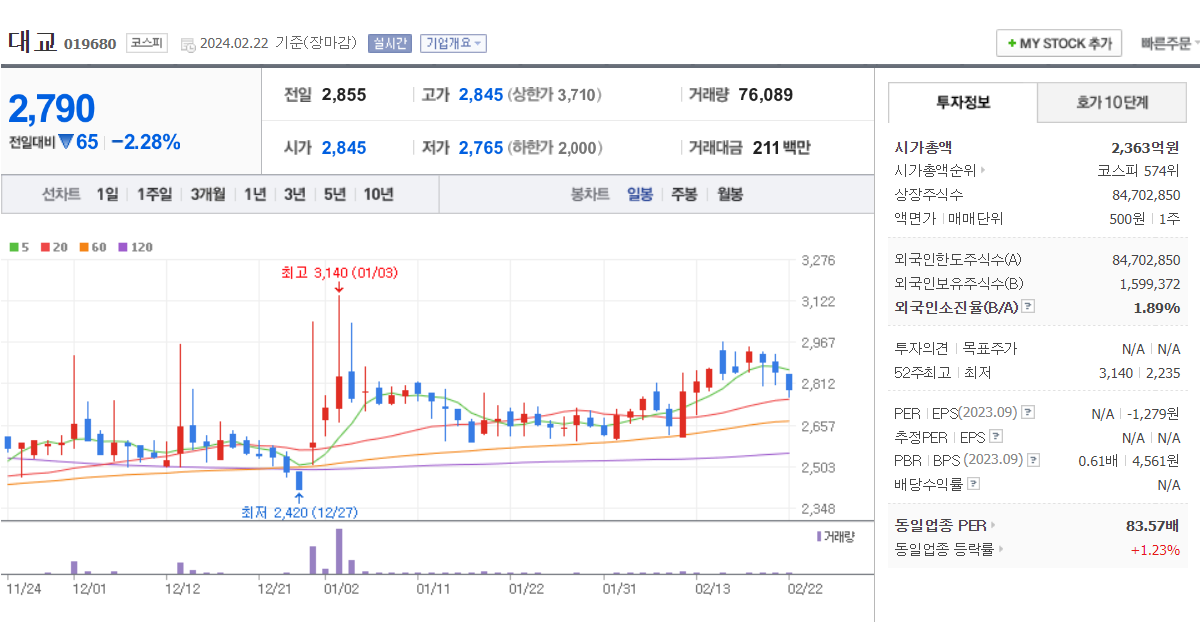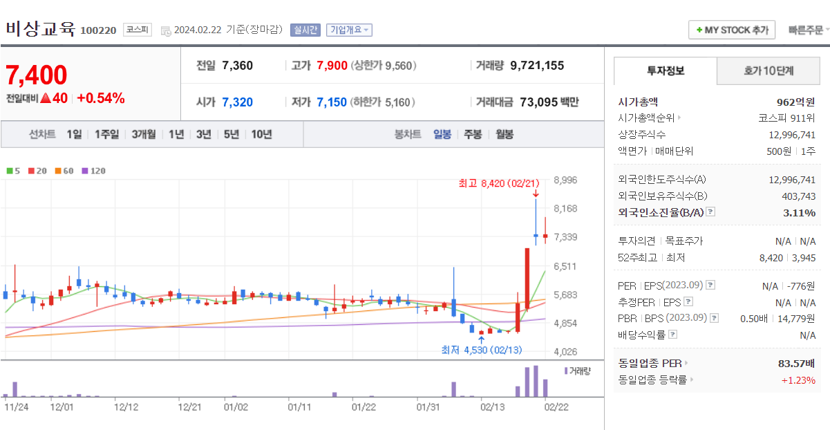 교육은 언제나 이슈가 되기 좋은 주제이다. 이번처럼 의대 정원관련한 이슈에도 엮일뿐더러 매년 바뀌는 교육부의 지침에도 출렁이는 모습을 보여준다. 작년에는 정부에서 발생한 수능 킬러문항 지침에 크게 움직임을 보여주었던 기억이 있다. 또한 저출산 관련하여 늘봄학교 시행 및 공교육 확대와 같은 정책이 나올 때도 움직였다. 이처럼 교육관련주는 어떠한 정책에 있어서도 쉽게 연관되며 반응하는 듯하다. 우리나라의 교육열이 높은 만큼 그 어디에도 쉽게 엮이는 테마라 생각되기에 알아두고 공부해 볼 필요가 있다. 의대 정원이슈로 인하여 나라가 떠들썩한 듯하다. 정부와 의사 간 서로 입장차이겠지만 그 피해는 국민들이 다 보고 있는 듯하다. 어느 방향이 되었든 서로 원만한 합의로 인하여 빠르게 정상화되었으면 하는 바람이다.
