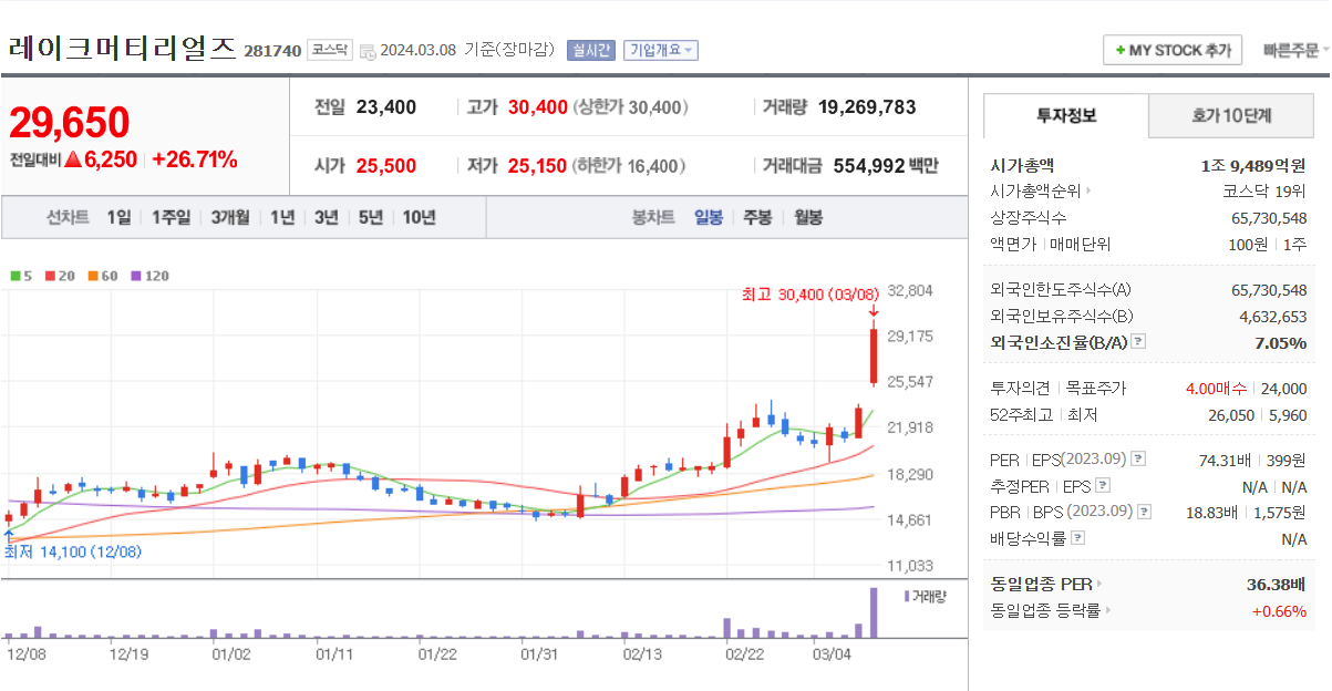 레이크테크놀로지에서 전고체 배터리용 황화리튬 사업을 준비 중이며 소재 개발을 완료하였다는 소식에 관련 테마주로 편입되었다.