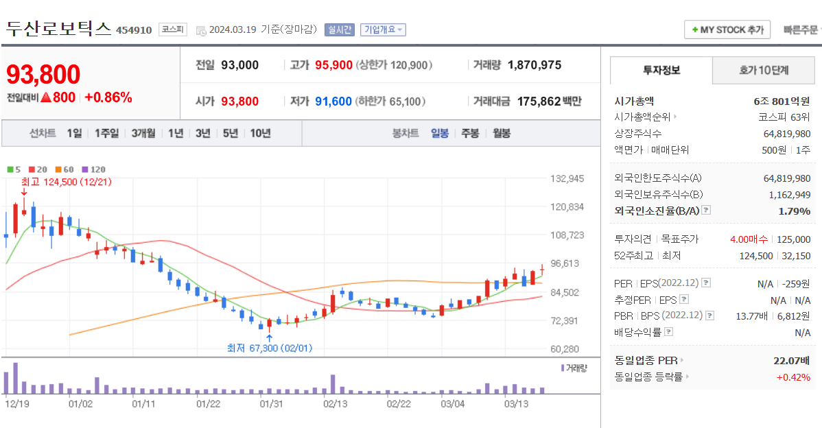 최근 대한 상공회의소 조사에 따르면 국내 기업들이 미래를 위해 준비하는 신사업으로 AI와 함께 로봇을 가장 많이 꼽았다. 상반기 주주총회를 앞두고 신사업으로 로봇사업을 추가한 기업들이 등장하고 있으며, 국내 시총 1위의 삼성전자는 최근 국내 휴머노이드 로봇 1호를 개발한 레인보우로보틱스의 지분 14.83%를 사들였으며, 현대차 그룹은 2021년 약 1조 원을 투자해 미국의 로봇기업 보스턴 다이내믹스를 사들였으며, LG전자는 로보스타의 지분을 30% 보유하고 있다. 이처럼 우리나라 최고의 기업들이 로봇 기술에 투자를 하고 있으며, 이는 우리나라 기업들의 신사업으로 새로운 성장동력이 될 것이라 예상된다.