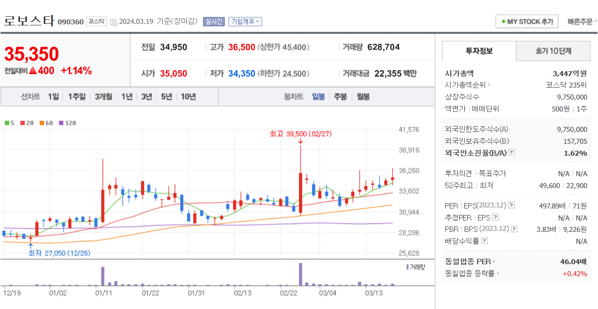 레인보우로보틱스와 국방로봇 분야 교류 및 협력사업 추진 MOU를 체결하였으며, LG전자는 2018년 로보스타의 지분 30%를 사들였다.