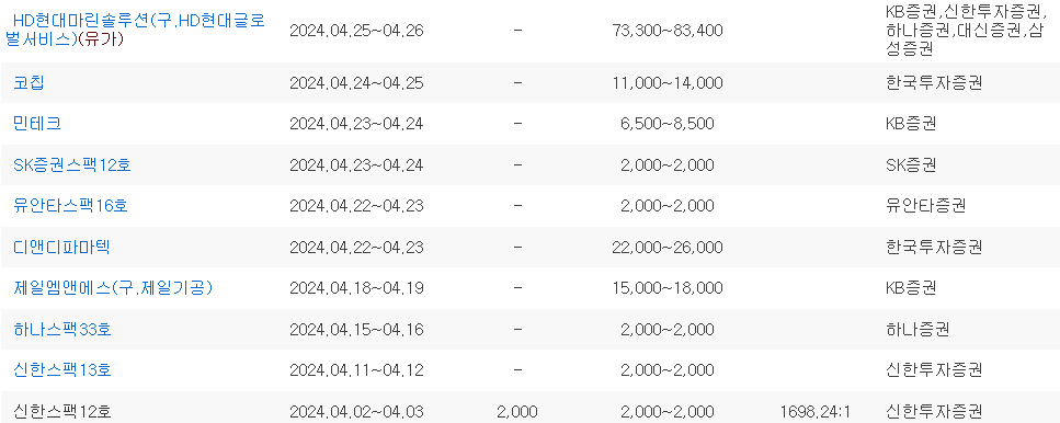 | HD현대마린솔루션 | 24.04.25~04.26 | KB증권,신한투자증권,한화증권,대신증권, 삼성증권 |