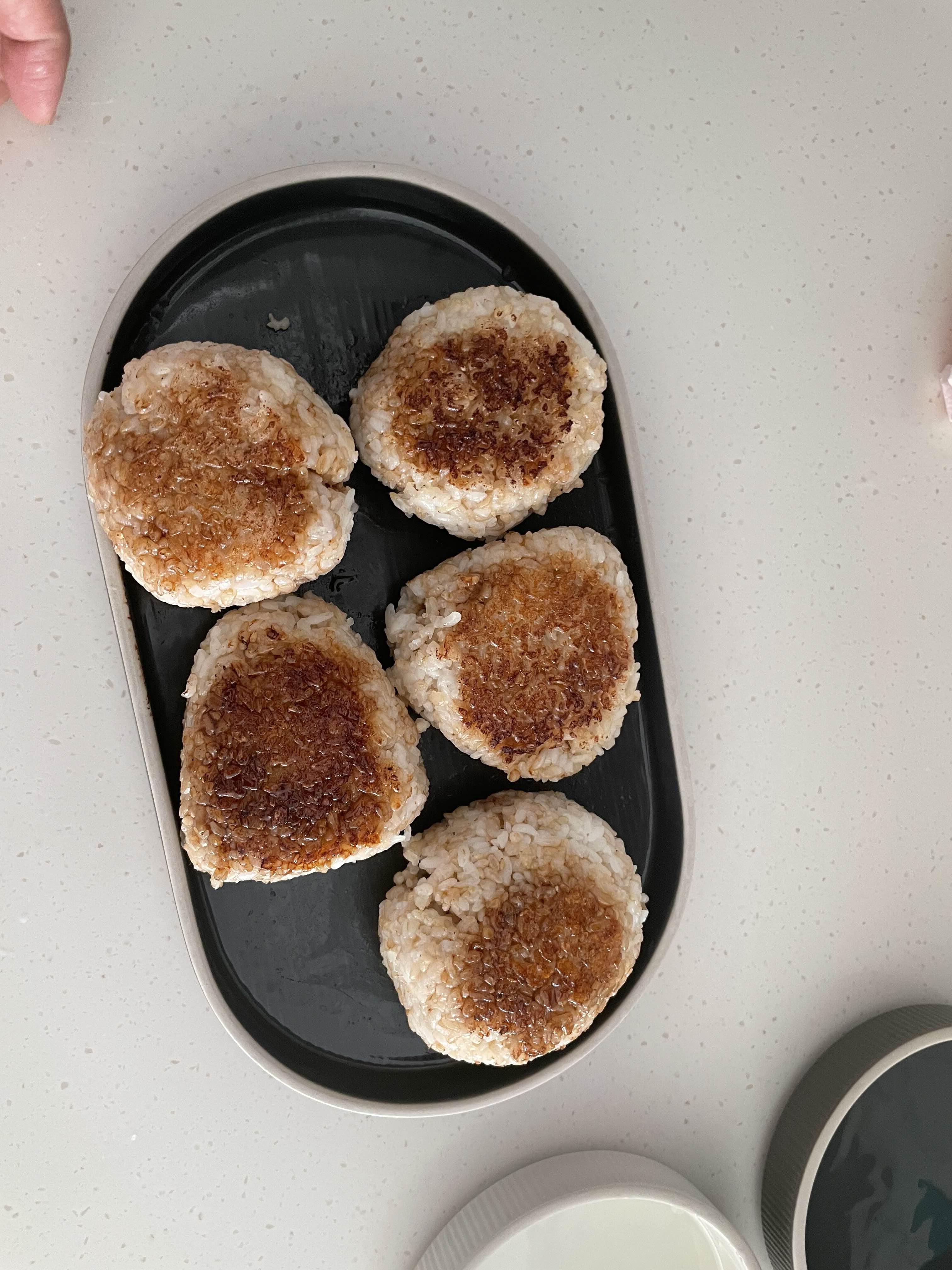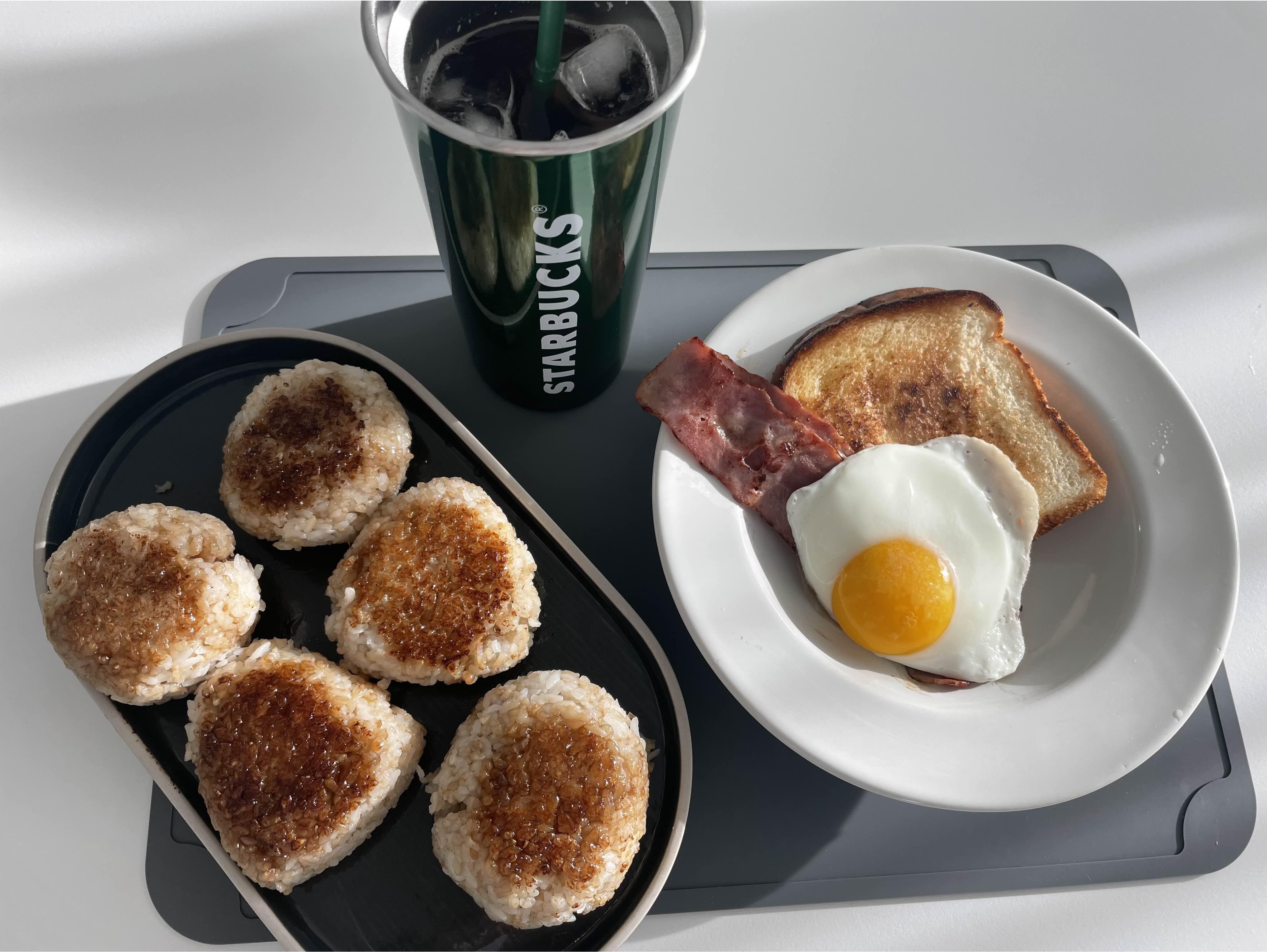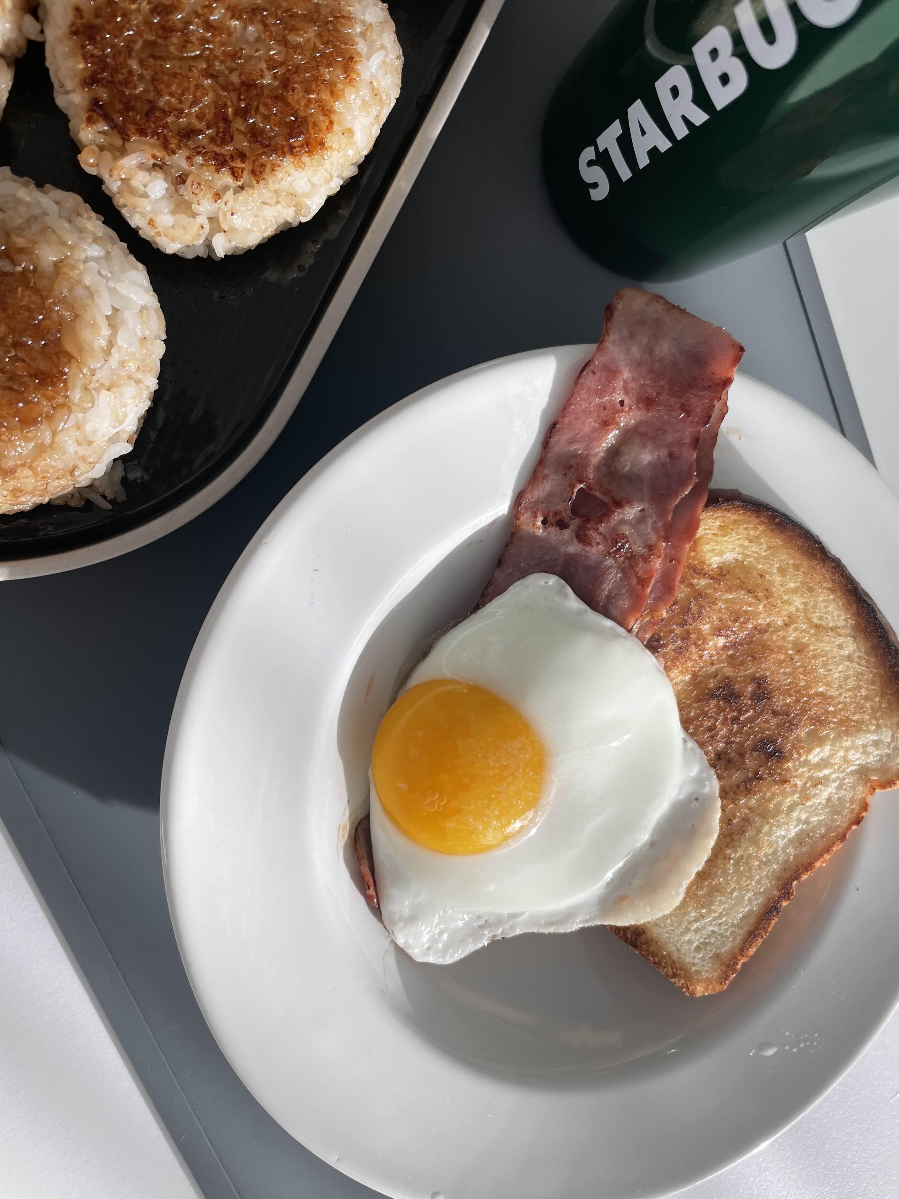 베이컨과 구운 식빵과 프라이를 자랑하는 것 같지만 놀랍게도 주먹밥이 주인공이다.