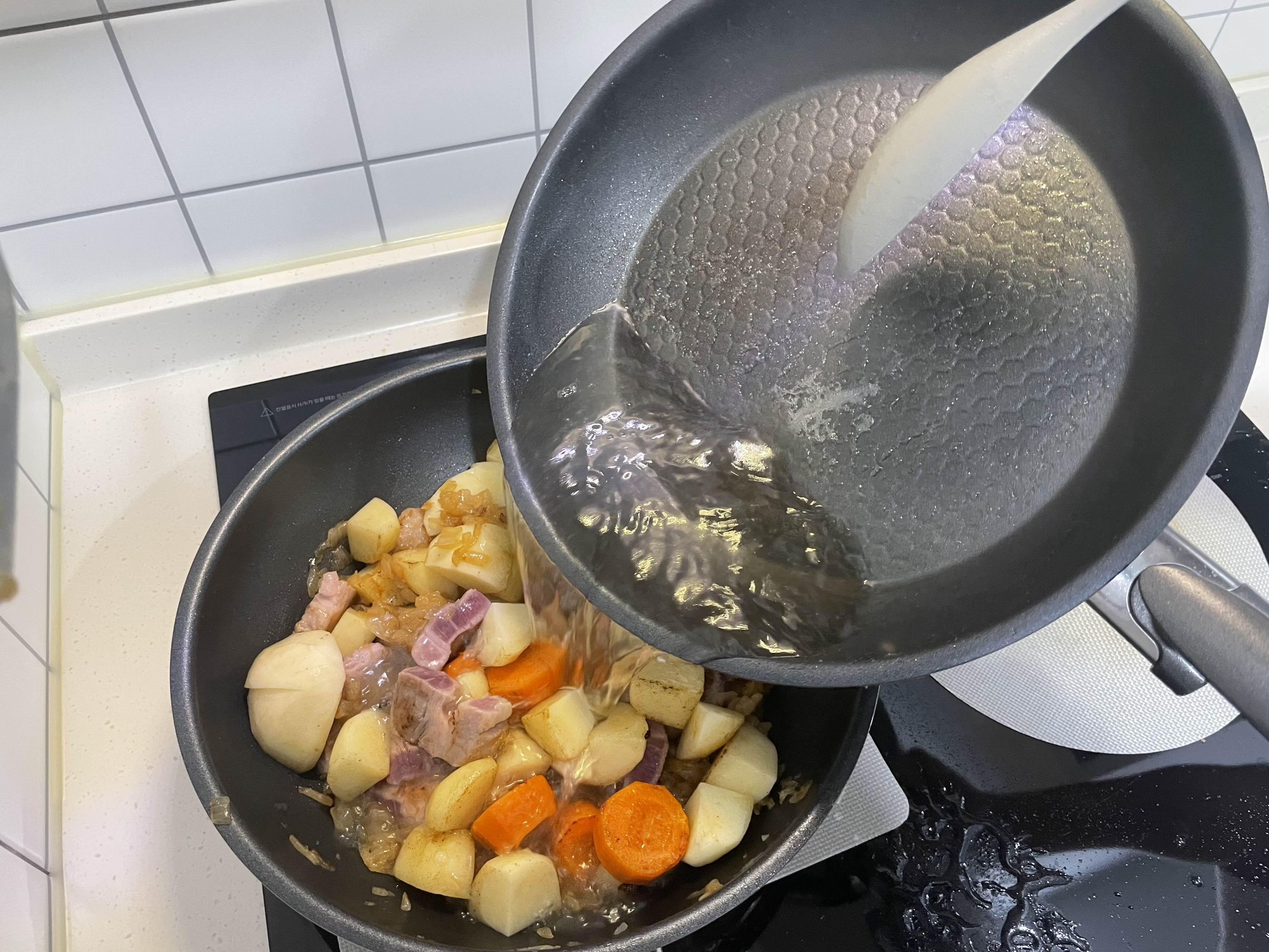 그리고 한 군데 모아주고 프라이팬에 맛난 기름에 물을 부어 물을 넣어준다