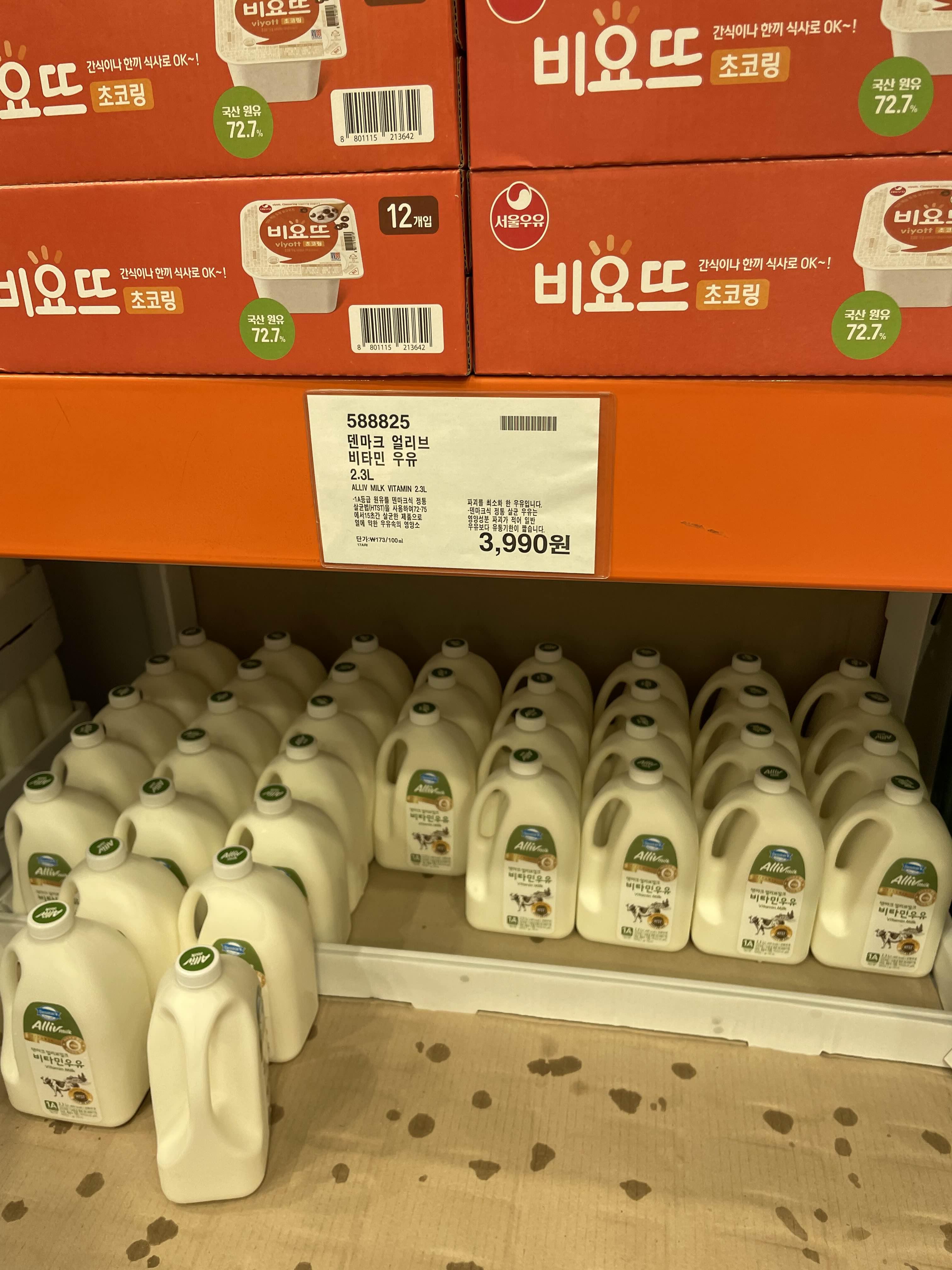 2.3L에 3,990원 맛도 나쁘지 않고, 가격도 이 정도면 합리적이다. 다른 마트 가면 죄다 4000원대였던 거 같아 우유도 여기서만 산다.