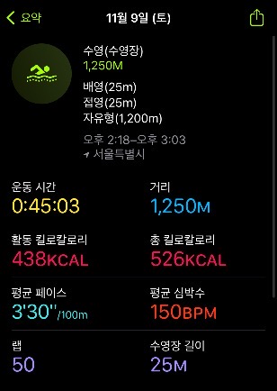 페이스를 당길 필요가 있을 듯하다. 1분 20초는 정말 흔히 말하는 할머니 회원분들 이하는 하마수영과 같은 속도이다. 이 페이스로는 45분 정도 걸릴듯하기에 1분 페이스로 당기기 위해서 노력을 해볼 필요가 있을듯하다.