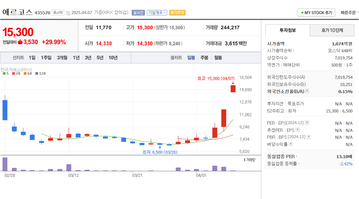 | 신성장 기대주 | 에르코스 | 영아 식품 관련 공약 확장 시 급등 모멘텀 기대 |