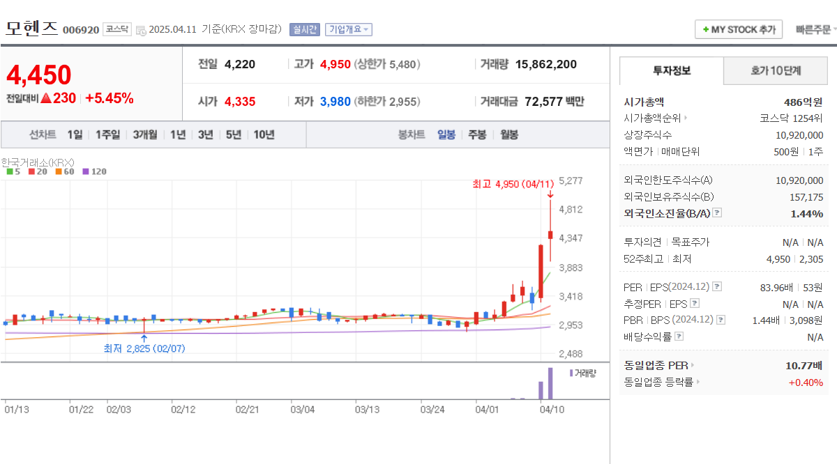 🔹 모헨즈 (006920) > 건설 자재·레미콘 > 새만금 개발 수혜