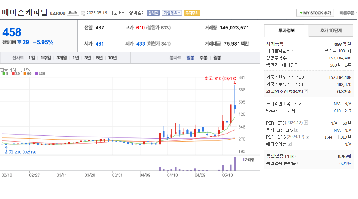 🔹 5. 메이슨캐피탈 (021880)