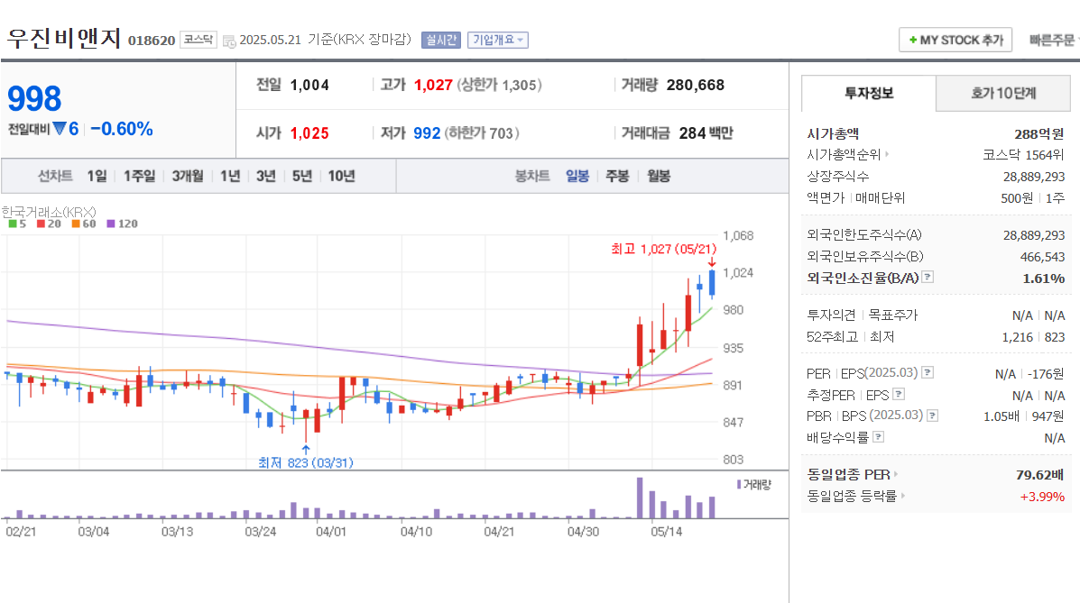 🔹 4. 우진비앤지 (018620)