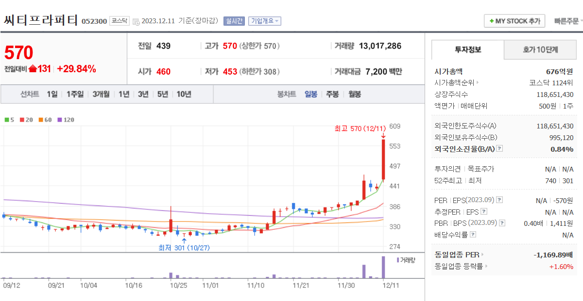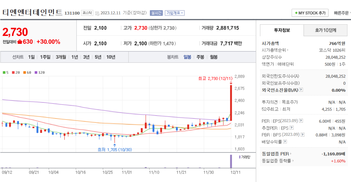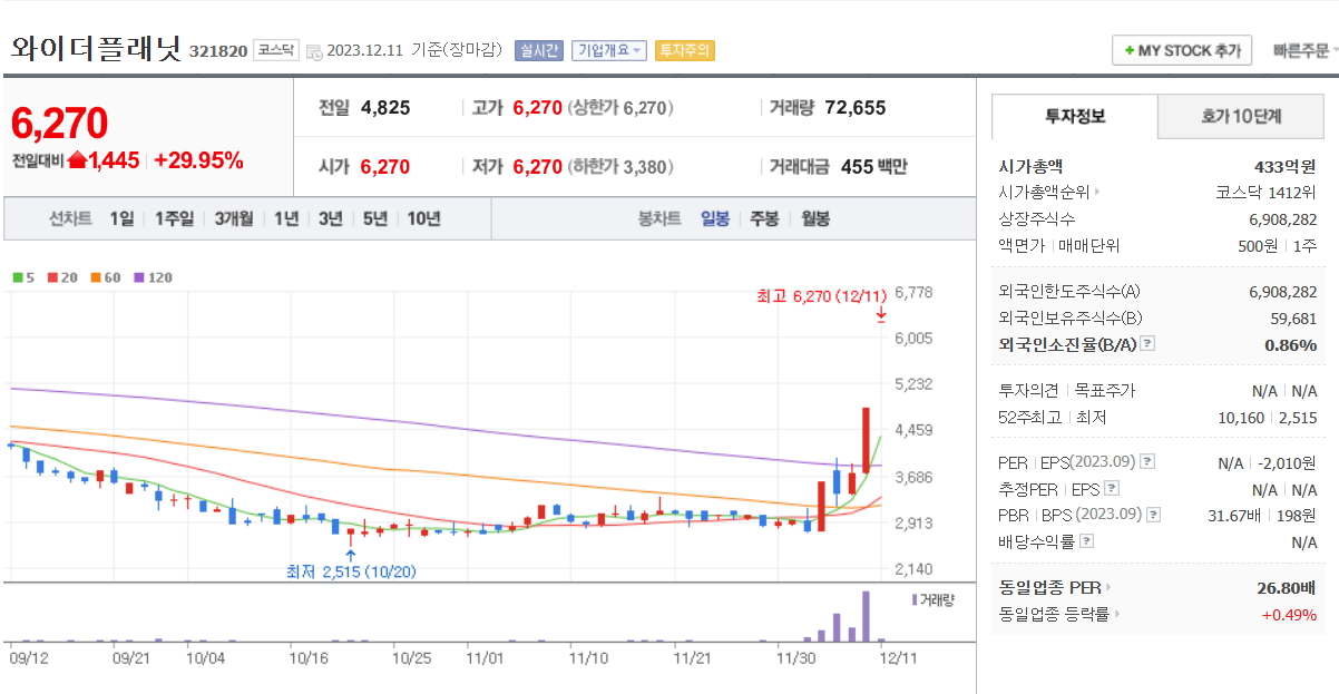 처음엔 이정재와 정우성이 모두 참여하는 와이더플래닛이라 시장이 반응하는 거라 생각했다. 하지만 생각을 해보니 대상그룹의 주식과 다를 게 없는 느낌이다. 한동훈 테마주로 엮이면서 대상홀딩스우는 지난달 24일부터 이달 8일까지 9 거래일 연속 상승을 보여줬으며 이 기간 동안 상승률은 579%에 이른다. 와이더플래닛 또한 다를 거 없지 않을까 라는 생각이 들었다. 한동훈 장관의 출마이야기에 더 힘이 실린다면 텐버거를 향한 랠리는 이제 시작이 아닐까 생각해 본다.