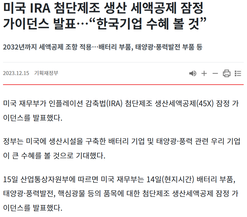 미국 재무부가 인플레이션 감축법 (IRA) 첨단제조 생산세액공제 잠정 가이던스를 발표했다. 첨단제조 생산 세액공제 조항에는 배터리, 태양광, 풍력, 핵심광물등이 속하며, 이를 통해 우리나라에서 미국 진출을 위해 미국에 공장을 설립한 배터리, 태양광, 풍력 관련 기업들이 수혜를 입을 것이라 예상된다. 이를 발표한 후 우리나라 주식시장에선 2차전지, 신재생에너지, 리튬 관련 주식들이 좋은 움직임을 보여주고 있다. 그래서 신재생에너지 관련 주식들을 모아 정리 해보았다.