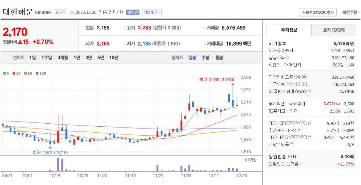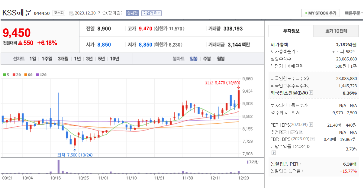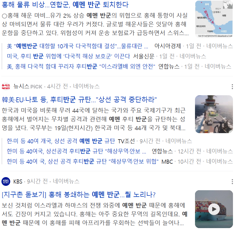 요즘 새로운 이슈가 있다. 예멘 후티 반군이 홍해를 지나는 선박들을 통제하겠다고 나선 것이다. 말로는 이스라엘 항구를 오가는 선박을 공격한다는 명분이지만 피해가 늘어가고 있는 듯하다. 이에 전 세계 대형 해운사들은 홍해입구 바브 알 만 데브 해협을 통해 수송을 중단한다는 결정을 내렸다. 바브 알 만 데브 해협은 중동과 유럽을 잇고 수에즈 운하와 연결되는 중요한 수송로이다. 이 수송로가 폐쇄된다면 부산에서 출발한 선박이 수에즈운하를 통해 유럽으로 가는 것이 아닌 아프리카 희망봉을 돌아 6500km 더 먼 길로 유럽으로 가야 한다. 이로 인해 해상운임이 증가할 수 있기에 증시는 해운 관련주를 주목하고 강세로 이어지는 듯하다.