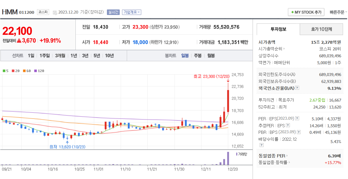 해운주의 대장주는 HMM으로 하고 싶다. 내가 오래 투자 중이라 고운 정, 미운 정 모두 들어버린 터라 그런 것도 있지만 우리나라 1등 해운사이기 때문이다. 또한 HMM은 하림과의 인수합병 이슈도 겹쳐 강한 상승을 보여주고 있다. 예멘반군의 선박 공격이 얼마나 이어질지 모르지만 이는 최고점이던 코로나 시절에 비하여 20% 수준 밖에 되지 않던 해상운임의 상승을 가져온다는 것은 투자자들에게 있어 긍정적인 시그널이다. 어느쪽에 배팅을 하던 신중하게 선택하시길 바라는 마음이며, 앞으로 어떻게 흘러갈지 다같이 지켜보도록 하자.