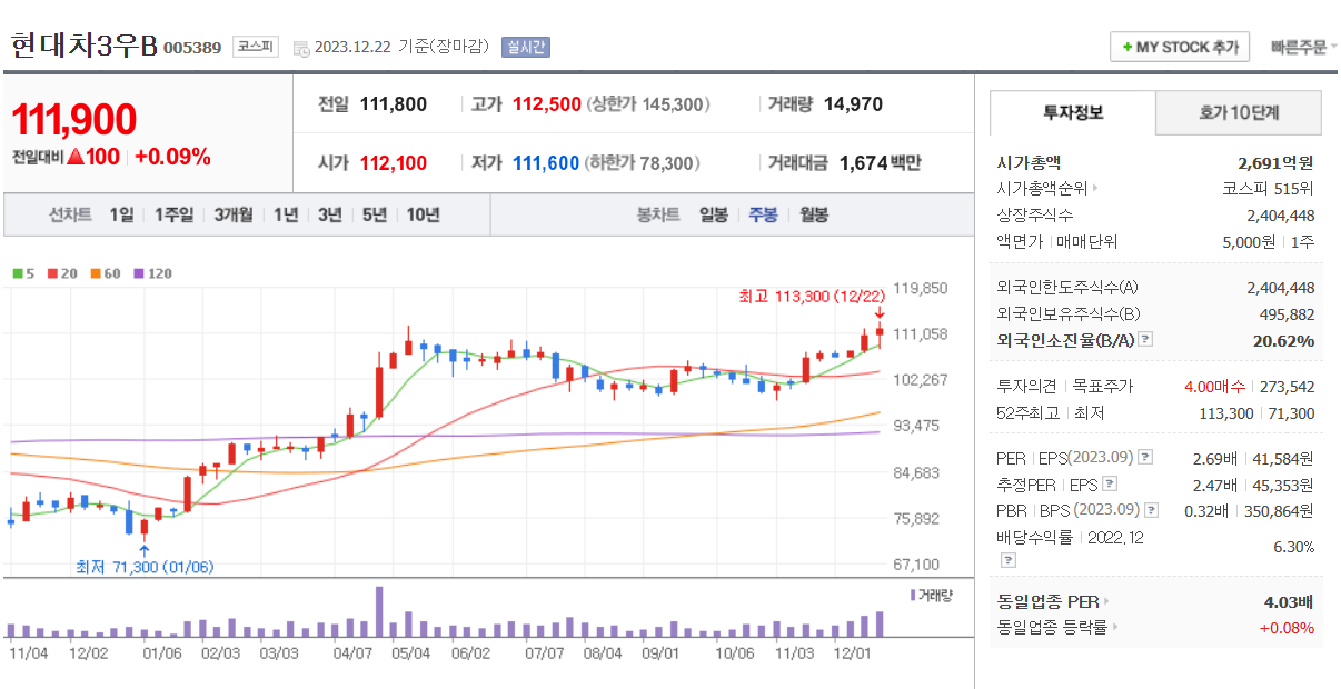 현대차 우선주는 현대차우,현대차2우B, 현대차3우B 3종류가 있는데 세종목은 큰 차이가 없다고 보며 된다. 자동차 시장에서 현대차의 포지션을 생각하면 장기적으로 우상향이 가능할 것이라 예상이 되며, 배당금 또한 코로나 이후 크게 늘어나는 중이다.