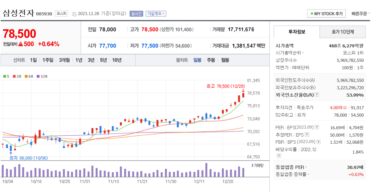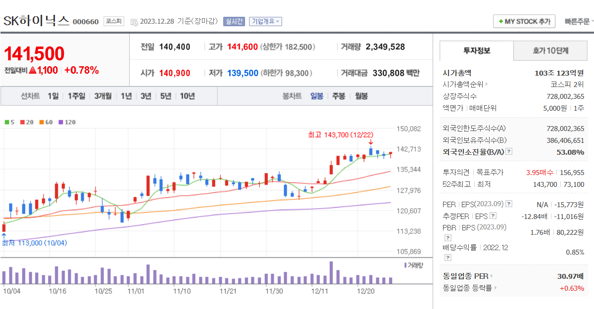 올해는 분명 2차 전지의 해였다. 하지만 올해엔 반도체도 빼놓을 수 없을 것 같다. 영원히 침체기에 접어들 줄 알았던 반도체가 다시 살아나는 모습을 보여주었다. 올해 초 54000원이었던 삼성전자는 7만 7000원 의 가격을 형성하고 있다. 하이닉스는 73,000원의 가격에서 140,000원이 되며 거의 두 배에 가까운 성장을 보여줄 만큼 반도체 시장은 되살아났고 인공지능기술의 발전으로 인해 내년엔 더더욱 매출이 성장할 것이라 생각된다. 그럼 대표적인 반도체 주식 5가지 정도만 정리해 보자.